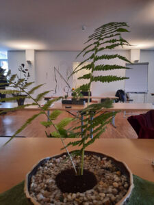 Einen Tag haben wir geschaut, sind durch den Wald gestreift auf der Suche nach welkem Farn. Im Wald war kein einziger welk, in den Beeten sehr wohl, doch das war nicht gewünscht, es sollte in der freien Natur gesucht und gefunden werden. Kurz bevor wir aufgeben wollten, fanden wir einen Büschel Farn, der näher am Waldrand stand und zartestes Gelb im Grün aufwies. Bingo. Bis dann alles in der richtigen Richtung, Aufreihung und Biegung passte, war es Abend. Staunend erlebten wir, wie die Meisterin des Ikabana einzelne Blüten und Blättchen in der Hand bog, Stängeln eine etwas akzentuiertere Biegung verpasste oder fragte: „Wo genau steht deine Sonne? Schau mal genau, du brauchst zwei Sonnen für deinen Farn, oder?“ Grandios, was man an drei Stängeln erleben kann und wie sicher man viele Male scheitert. „No more plants were harmed“ übrigens. Ganz strikte Anweisung: Nur entnehmen, wenn die Entscheidung klar gefallen ist. Lieber zehn Mal schauen als einmal schneiden. Achtsamkeit vom Feinsten.